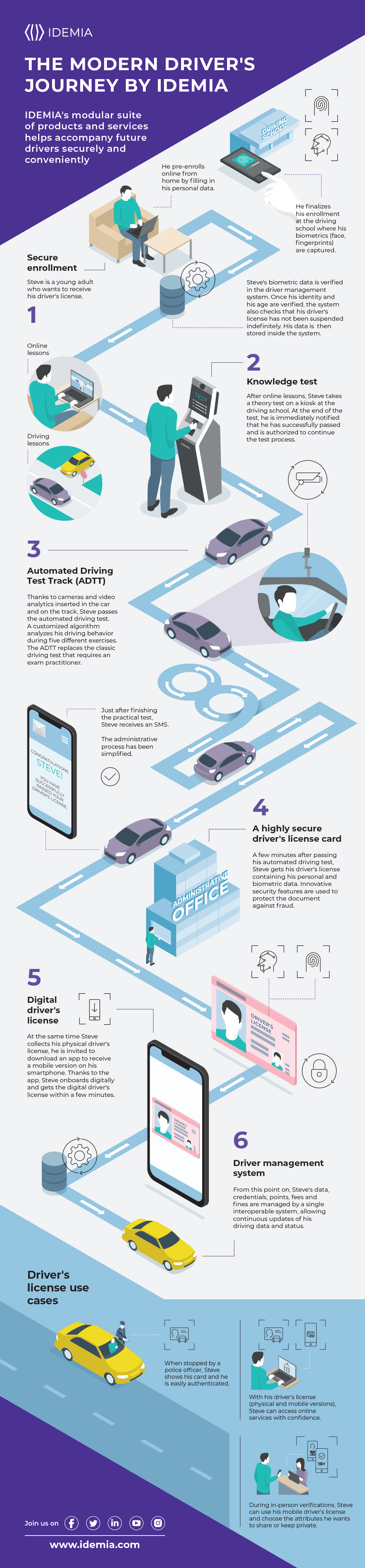 Drivers are looking for easy, flexible and fast solutions when it comes to applying, renewing or receiving a license, and accessing online services. Discover in this infographic how IDEMIA makes the end-to-end application and testing process evolve for a more secure and convenient experience.
